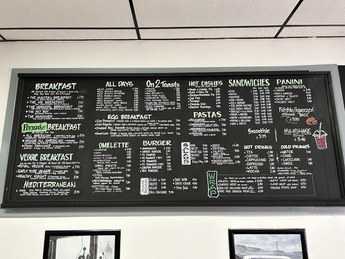 The menu is organized into several main categories to cater to different meal preferences throughout the day. For breakfast and light meals, options include traditional English Breakfast items such as Eggs Benedict and fry-ups, as well as choices like pancakes with fresh fruit and maple syrup. The café also offers a variety of sandwiches including egg, bacon, sausage, bacon avocado, and ham & cheese combinations, suited for quick and casual dining.